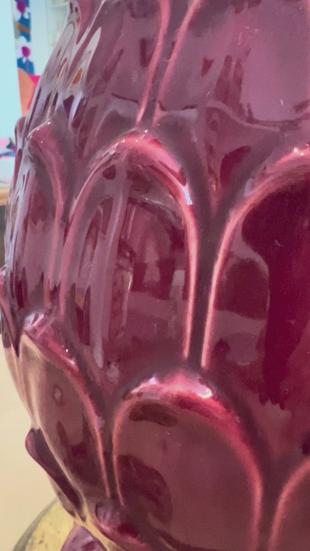 Very large vintage Manises table lamp, with pomegranate red glaze. This lamp is in perfect condition and mounted on a gilded wooden base typical of the style and period, estimated 1970s. The original brass topper is cast with a leaf design, completes this beautiful lamp from the well-renowned Spanish maker. Rewired to EU standards (E27 bulb connector, cable and switch). Sold without shade.