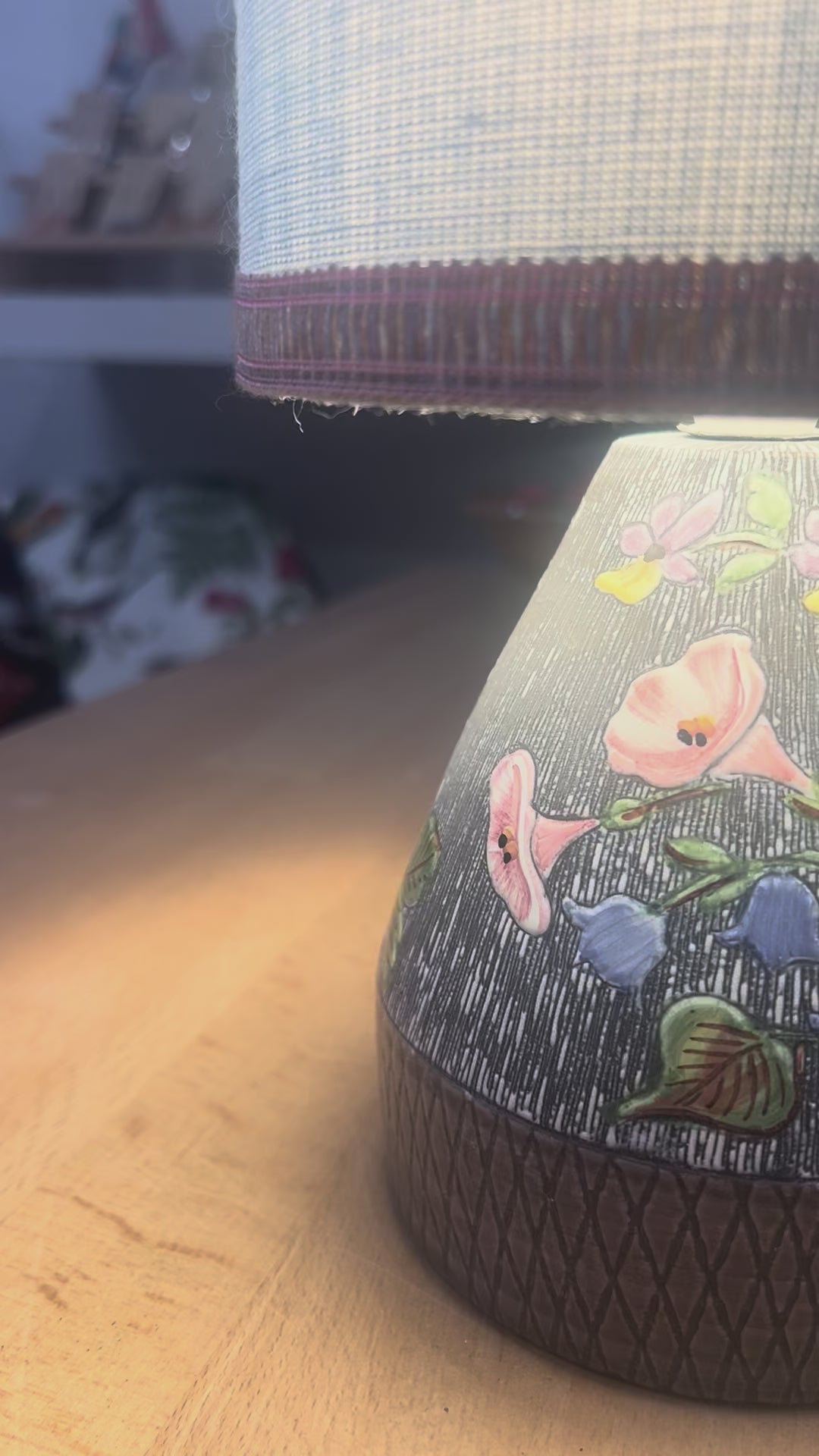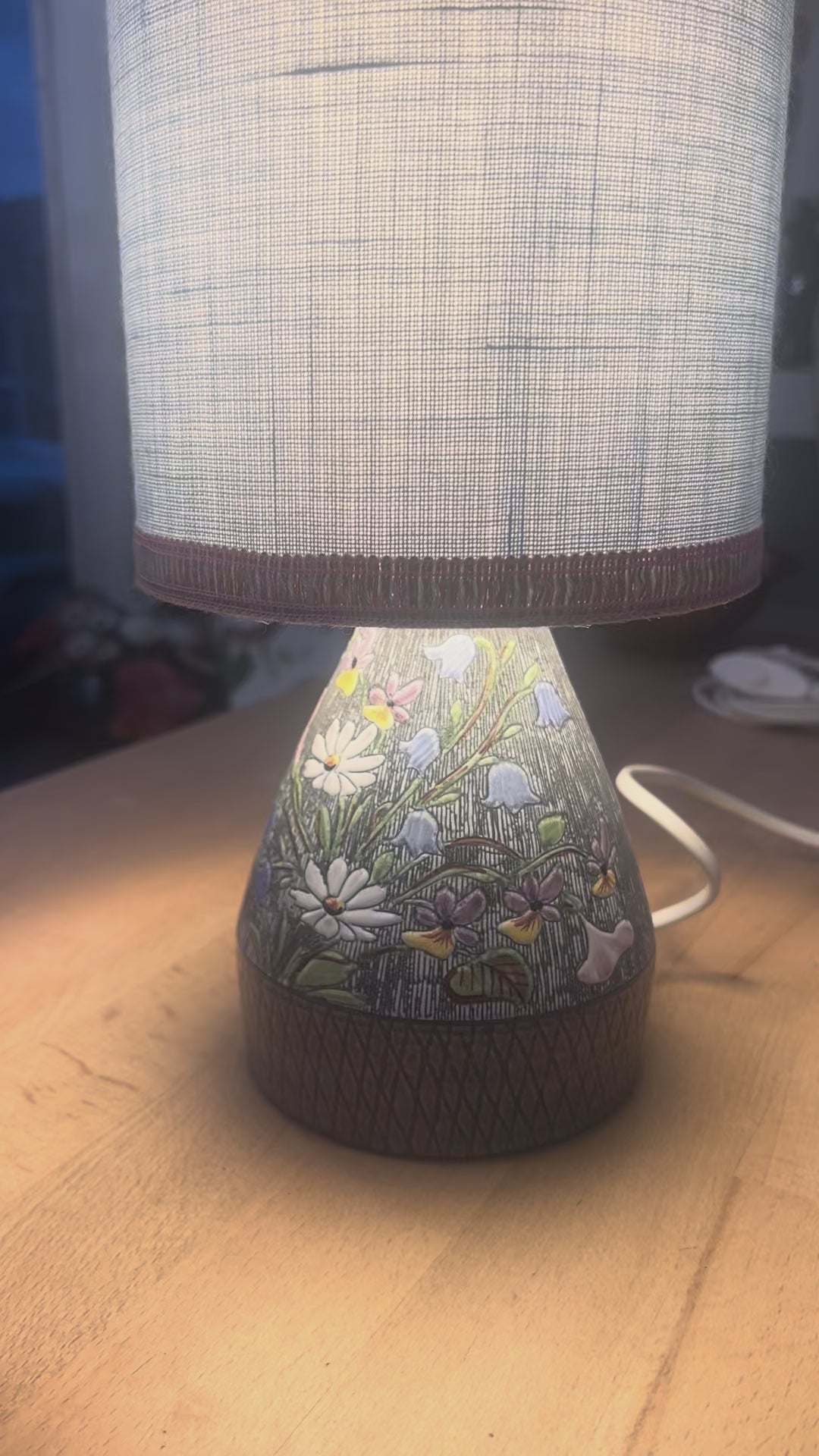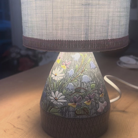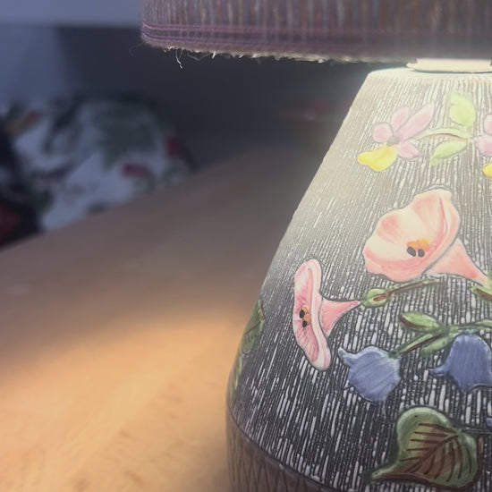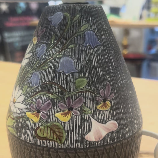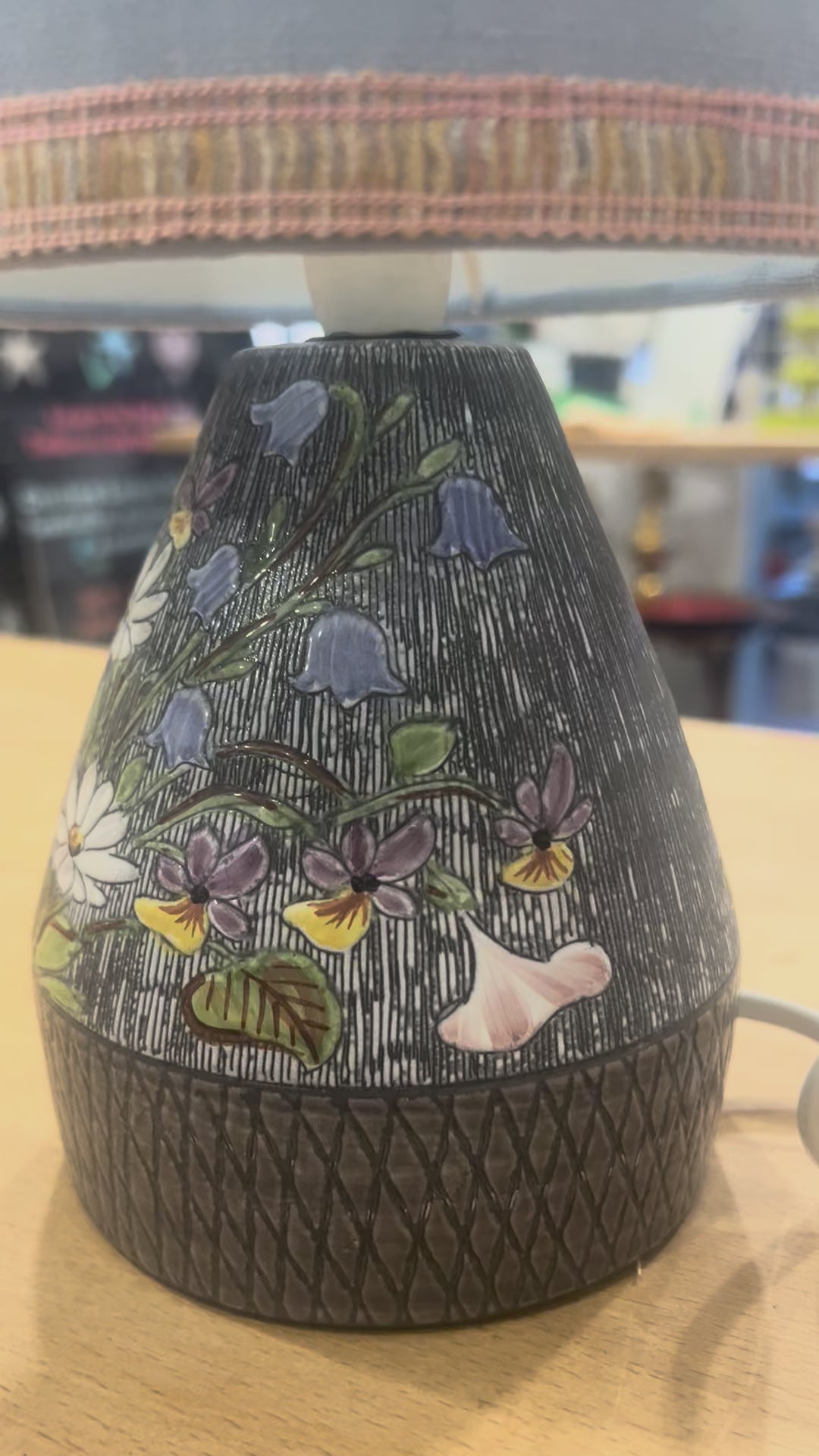 A very pretty floral vintage Swedish mid-century ceramic lamp, signed GB and numbered 23 by the artist. A rare find. Utilising the Sgraffito technique, this lamp is adorned with colourful country flowers. The handmade, soft blue linen lampshade with pink trim top and bottom, and a white interior, will brighten even the darkest corner of your home.