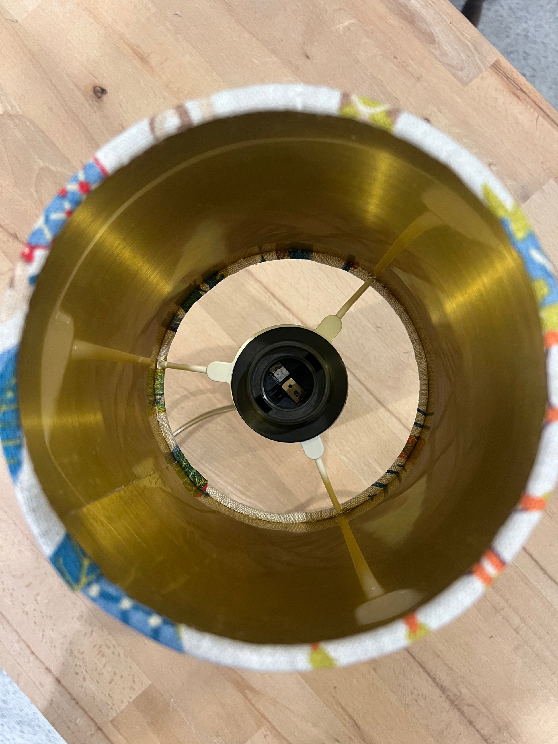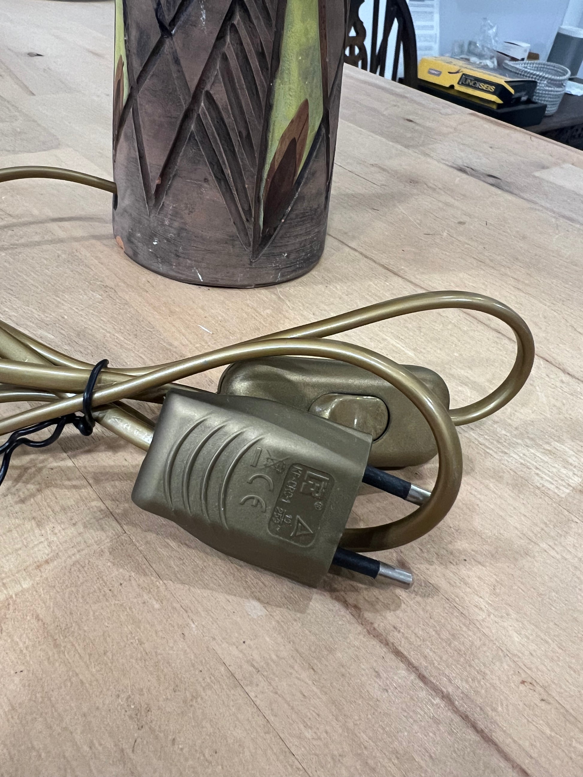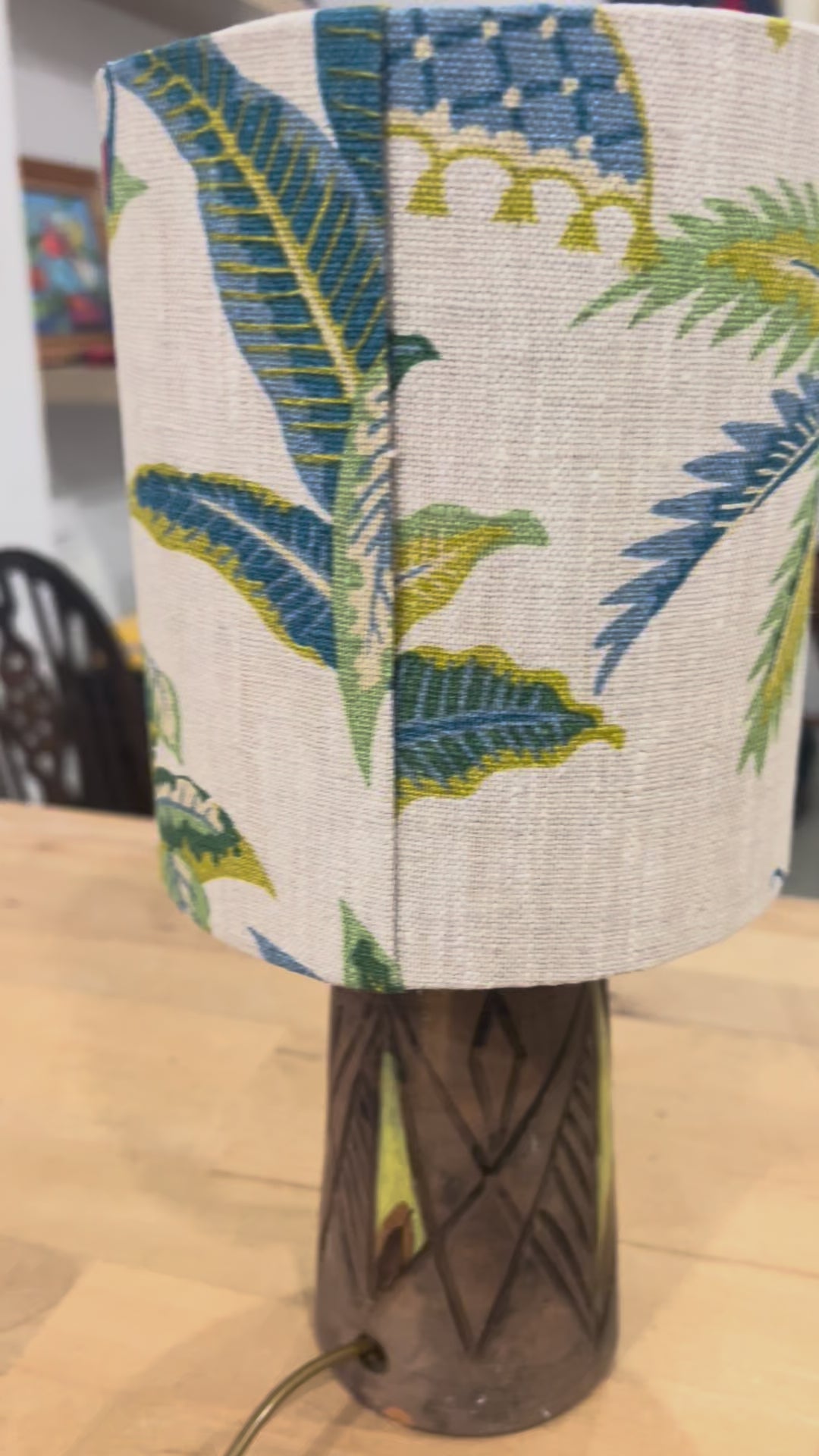 A delightful pairing of vintage Swedish mid-century pottery lamp base with 100% linen lampshade and brushed gold interior. The lamp has been completely rewired with new cable, switch, plug and bulb connector - E27.